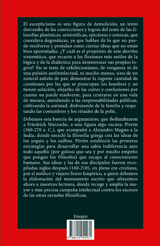 Debemos esta batería de argumentos, que deslumbraron a Friedrich Nietzsche, a una figura algo oscura, Pirrón (360-270 a. C.), que acompañó a Alejandro Magno a la India, donde mezcló la filosofía griega con las ideas de los yoguis y los sadhus. Pirrón estableció las primeras estrategias para desarrollar una sabia indiferencia ante todo aquello (por goloso que sea y por mucho empeño que pongan los filósofos) que escapa al conocimiento humano. Sus ideas y las de sus discípulos fueron recopiladas siglos después (160-210), en plena era cristiana, por el médico y viajero Sexto Empírico, a quien debemos la elaboración del monumento escrito que ofrecemos ahora a nuestros lectores, donde recoge y amplía la mayor y más precisa campaña intelectual contra los excesos de las otras escuelas filosóficas.