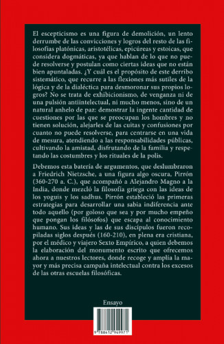 "Con este volumen, se ofrece no solo una puerta de entrada al escéptico más influyente antes de Montaigne, sino también un espejo incómodo para nuestro presente, tan propenso a los diagnósticos tajantes. El prólogo de Torné destaca justamente este punto: la lucidez de Sexto Empírico reside en mostrar que todo sistema, por sólido que parezca, descansa sobre supuestos discutibles. Leído desde hoy, este "Escepticismo" funciona como un ejercicio de higiene intelectual y como una invitación a convivir con la duda sin caer en el nihilismo. Que un texto de casi dos mil años conserve su potencia crítica es la mejor prueba de la pertinencia de esta edición, llamada a situarse, como sus precedentes, entre las más estimulantes puertas de acceso a la filosofía antigua"
